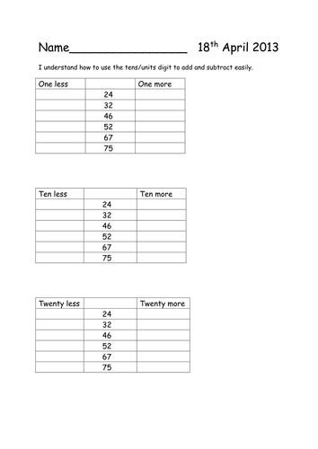 Ten more ten less math worksheets. templatelab.com › ten-frame36 Printable Ten Frame Templates (Free) ᐅ TemplateLab When making use of the template, students will be able to see concretely the relationship of the symbol and the quantity clearly. For instance, the student will be able to see that 7 is two more than 5 and 3 less than ten. Or that 6 is “5 and 1 more” or 4 away from 10. EOF › powersoftenPowers of Ten Worksheets - Math-Drills Multiplying and Dividing Decimals by Positive Powers of Ten (Standard Form) (12 views this week) Multiplying and Dividing Decimals by 10 (8 views this week) Multiplying and Dividing Decimals by All Powers of Ten (Exponent Form) (6 views this week) Learning to Multiply Numbers (Range 10 to 99) by Positive Powers of Ten in Exponent Form (4 views this week) Multiplying and Dividing Whole Numbers ... › mathsKindergarten Math Worksheets - Preschool Math Worksheets ... From number recognition to counting, number formation, tracing, ordering, more or less concept, basic addition and subtraction we have free math worksheets for all the learning requirements of your child. Do check our hundreds of free printable preschool and kindergarten math worksheets here.